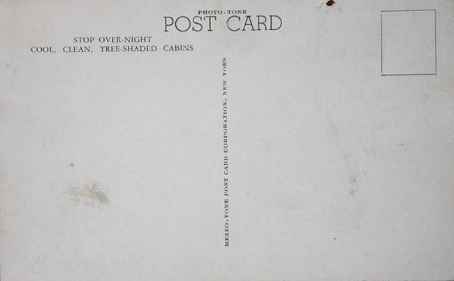 The back of the postcard features an advertisement of the overnight accommodations at Forest Rest: cool, clean, tree-shaded cabins.