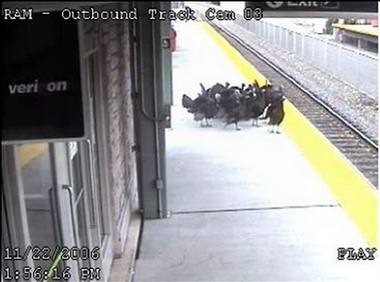 A blast from the not so distant past: wild turkeys on the train platform. Caught on surveillance camera at the Ramsey Route 17 train station in 2006, a group of turkeys leaving town before Thanksgiving.